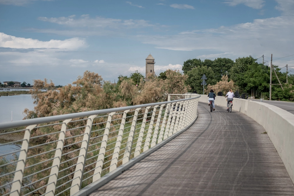 Das ist der Radweg, der Cavallino Treporti bekannt gemacht hat – und einer der meistfotografierten in ganz Italien. Der Weg verläuft entlang des Kanals Pordelio, teils auf Holzplanken, die buchstäblich über dem Wasser schweben. An manchen Stellen tauchen bei Ebbe die Barene auf, und Flamingos nähern sich, ohne dass man sie sucht.
