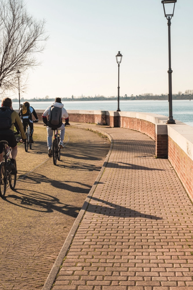 Man startet am Piazza Santa Maria Elisabetta – der Terrasse auf der Lagune im Herzen von Cavallino – und kann bis nach Punta Sabbioni fahren. Oder man steigt an einem beliebigen Zwischenpunkt ein und fährt so weit, wie die Beine tragen: eine falsche Richtung gibt es hier nicht.